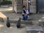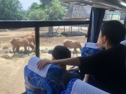 ぐんまサファリパークです。バスの中から動物を観察したり、実際に触れ合ったりして楽しんでいます。暑いですが、みんな元気です。