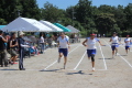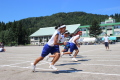 競技は続きます。 南中名物100m走!!校長先生による全選手の紹介のあと100mを走りました!!【写真左】 代表リレーは、職員チームも激走しました。【写真中】 そして、すっかりお馴染みになりました小中交流の「大玉送り」とおどり【写真右】そのあとには「肩もみ作戦」もありました。