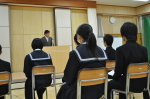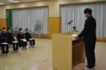 涙の三送会から一夜明けて、来週の今日は卒業式です。春の粉雪が舞う一日となりました。 今日は清水克佳同窓会会長をお迎えして、同窓会入会式が行われました。 清水さんは南中初代暁会会長で、現在は山梨県の中学校で教鞭をとっていらっしゃいます。 今日は入会式のために来校していただき、激励の言葉をかけてくださいました。【写真上】 卒業生を代表して田中大夢君が「誓いの言葉」を述べました。【写真下】 今度はOB、OGとして南中を支える立場になっていきます。