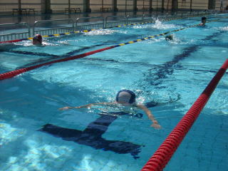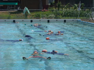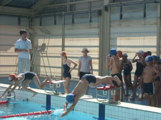 【南部郷合同水泳練習】 7月20日(水)は南部郷の小学校の5、6年生が市民で練習しました。 50メートルプールで泳ぐのは、初めてという子どもたちも多かったのですが、泳いで見ると「泳ぎやすいなあ。」との声も聞かれました。 飛び込みにも挑戦し、ご覧のとおり上手になりました。 |