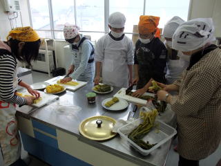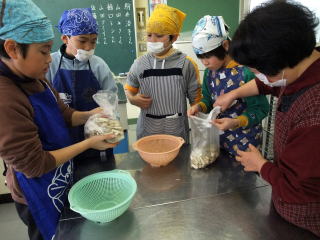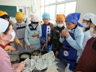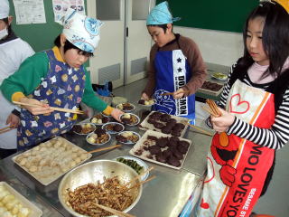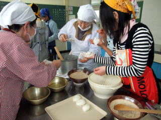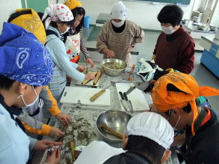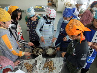 平成22年1月29日(金)に「岩沢まごころ市」の皆さん方5名の協力をいただきながら、「残しておきたい、伝えたい『岩沢のごっつぉ』」の中から「ぼたもち」「ごぼうのから揚げ」を作りました。