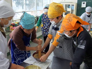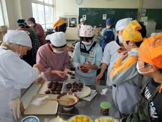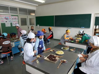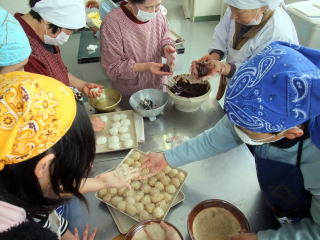 5年生全員が初めての「ぼたもち作り」で楽しそうに作っていました。
