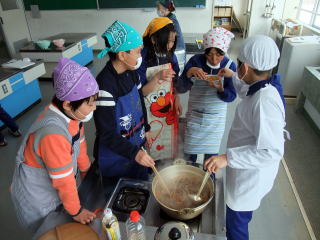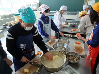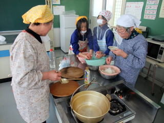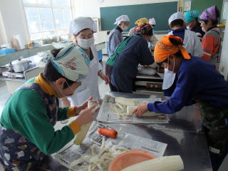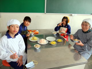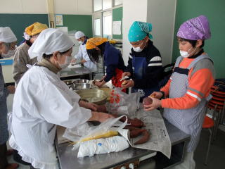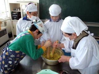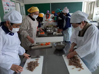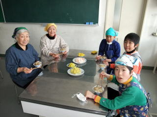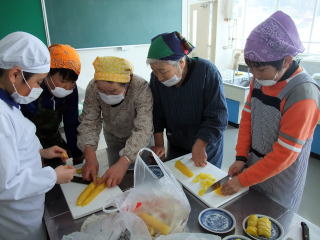 2月23日(火)の5・6限に「岩沢まごころ市」4名からおいでいただき、「残しておきたい、伝えたい『岩沢のごっつぉ』」の中から「五目赤飯」「白なます」「さつまいもキントン」を作りました。