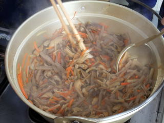 ・ 五目赤飯の具のこんにゃくを鍋に入れたら、ジュージューといってすごい音がしました。