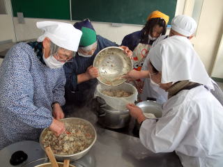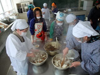 | “五目”と餅米を混ぜています | 五目御飯の出来上がり |