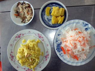 ・ さつまいもキントンは甘く、五目ご飯もちょうどいい味でとてもおいしかったです。やっぱり地産地消の野菜はとてもおいしいです。