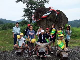 | 小千谷闘牛場で東山小の説明を聞きました | 「見守り岩」の前で! |