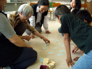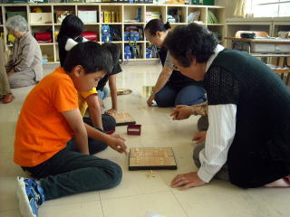 次の「昔遊び」では、2つのグループに分かれて、百人一首、はさみ将棋、折り紙、あやとりなどを行いました。「小学校5年生の時に担任に毎日2首ずつ覚えさせられたので今でもほとど言えますよ」という方もいらっしゃって子どもたちもびっく。