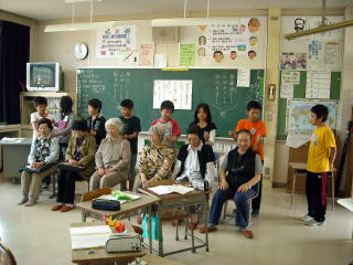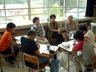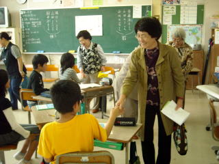 5月26日にはお招きいただき有難うございました。教室の中いっぱいに日頃先生と皆さんとが色々なことにチャレンジしながら一生懸命に勉学に励んでおられる様子が伺われ、とても頼もしく思いました。 自分の考えていることや知りたいことをきちんと人に伝えることの出来る皆さんは、素晴らしいですね。私は「欲しがりません、勝つまでは」と自分の思っていることなどは言ってはいけない戦争中と戦後の食糧難の苦しみの中で小学生(当時は国民学校)生活を送りました。でも楽しい思い出もいっぱいありますよ。皆さんは平和で自由な時代の小学生でよかったね。 百人一首、はさみ将棋、折り紙ととても楽しく遊ばせていただきました。その上、皆さんからマッサージや心のこもったプレゼントまでいただき、涙がこぼれるほど嬉しかったです。皆さんの柔らかな手のぬくもりが体に伝わってきてまごころ市のばあちゃんたちに元気と勇気を与えてくれました。また、私たちでお役に立てる時には声をかけてくださいね。いつでも喜んでおじゃまします。心のこもったお手紙、写真、新聞までいただき本当に有難うございました。 |