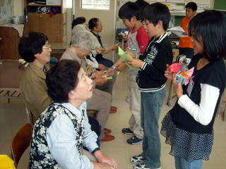 各自が折り紙や絵などのプレゼントを渡した後に別れる際に、「とっても楽しかった」「若返ったようです」などと話され、感涙されておられた方もいらっしゃいました。