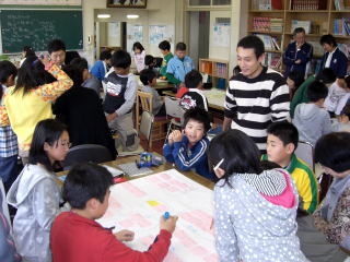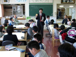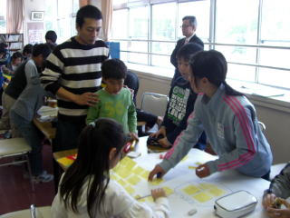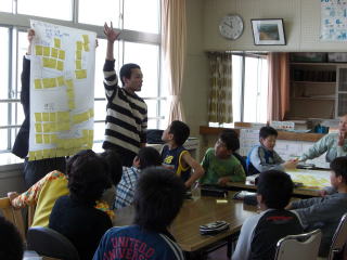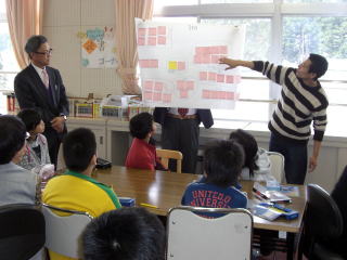 映画「降りてゆく生き方」の制作を支えた“新潟オリエン隊”(応援団)の清水さん(隊長)と長崎さん(代表)を迎え、4〜6年生に十日町市や長岡市などで映画を撮影した際の裏話を聞かせていただいた後、ワークショップを行いました。