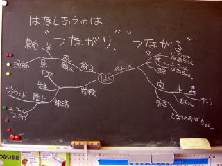 友達、家族、まごころ市、自然などというつながりだけでなく、「ズックと足」「ボールとバット」などというユニークなものも出て一同大爆笑。自分とのつながりをあれこれ考えることで、いのちのつながりに目を向けた子どももいました。最後に映画のダイジェスト版を見せていただき、ジ・エンド。