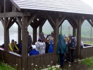 | 藤巻山へ出発直後に雨が・・・ | 東屋に避難したものの雨は上がらずUターン |