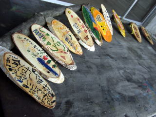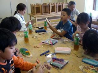| 白樺の壁掛け作り | ボランティアの方とニスをかけています |