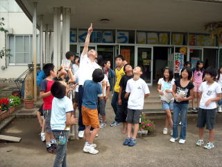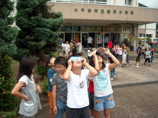 7月22日(水)は、早朝まで雨。朝からもあまりいい天気でなく、日食を見ることは無理か・・・とあきらめていました。が、10時半頃から天候がよくなり、11時頃には全校で玄関前に集まって空を見上げました。願いが通じて雲の切れ間から日食を見ることができました。
