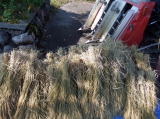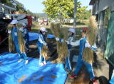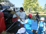 子どもたちは干してあった稲を協力しながら機械の前まで運び、脱穀作業の手伝いをしました。