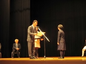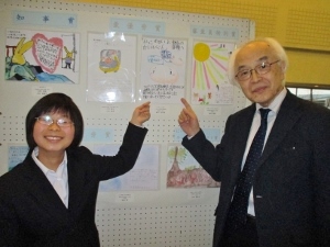 11月28日(土)、長岡市中之島文化ホールで「読書おたよりコンクール」(主催:県教育委員会生涯学習課)の表彰式がありました。高等部3年生の樋口あゆ美さんが、中学生以上の部で最優秀賞をいただきました。審査委員長で当日講演された作家の柳田邦男様と一緒に記念の写真をとりました。 樋口さんが読んだ本は「かっこわるいよ! だいふくくん」という本です。こころあたたまるお話です(同記事は「学校だより8号」にも掲載しています。そちらもご覧ください)。
