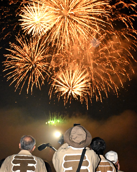 ![]() お立ち台で自分たちの花火を見上げるつくし会のみなさん |