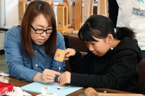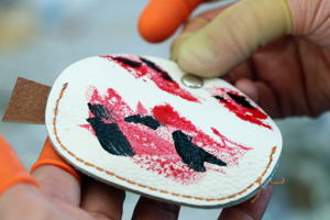 参加者は講師の指導のもと、皮や糸選びから手縫い、色塗りなどを行い、世界で一つだけのオリジナルコインケースを作りました。