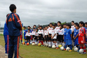 教室では、まずロングパスの蹴り方やドリブルの練習など、選手から直接指導を受けながら行われました。子どもたちは少し緊張しながらも、真剣に選手のアドバイスを聞き、練習に取り組んでいました。