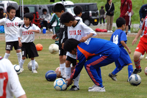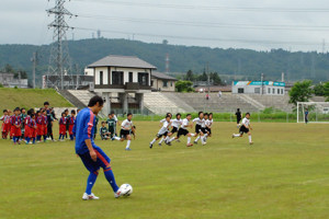 ![]() 選手からボールの蹴り方など、直接指導を受けました | ![]() 誰にもぶつからずにドリブルをする練習も行われました |