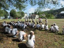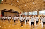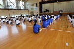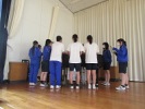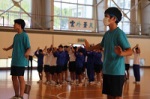 9月も2週目に入っても厳しい暑さが続いています。この日は1,2限に競技の練習を行いました。係の生徒が入退場の一連の動きを参加生徒に説明しています。暑さが増してきたので2限は屋内に移動して軍ごとの応援練習を実施ました。写真はダンスの振り付けの細かな確認をしているところです。