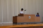 酷暑の中、一学期の終業式を行いました。体育館での開催は厳しいと考え、放送を使って空調の効いた教室での開催にしました。写真は、一学期の振り返りを述べる代表生徒です。休み中、普段できない様々な学びの経験をして、元気に学校に来るように伝えました。