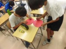 休み時間は、東雲祭の応援グッズの制作が盛んにおこなわれています。写真は、1年生の昼休みの教室での様子です。軍のカラーのうちわと、カウントダウンカレンダーの制作に、生徒が一生懸命に取り組んでいます。おしゃべりを楽しみながら取り組んでいる様子がほのぼのとしています。