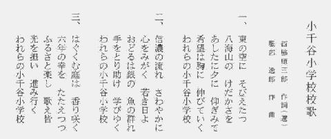 新しい校歌は,広く一般の人々から募集しました。その結果,佐藤真理(さとうまこと,古志郡下塩谷村,今の栃尾市)さんの詞に決定し,西脇順三郎さんが補作しました。曲は服部逸郎(はっとりいつろう)さんがつけました。
