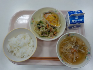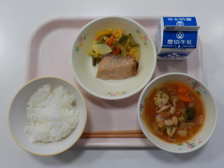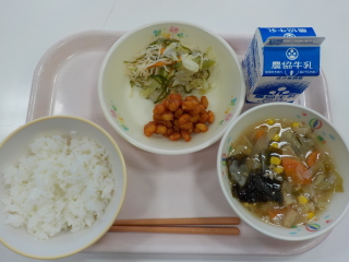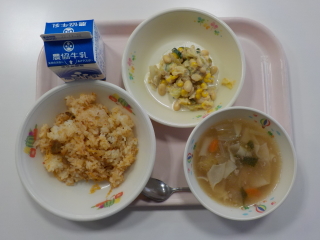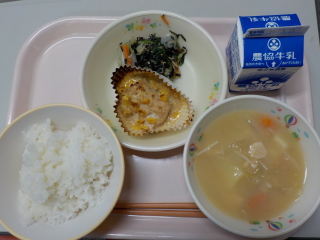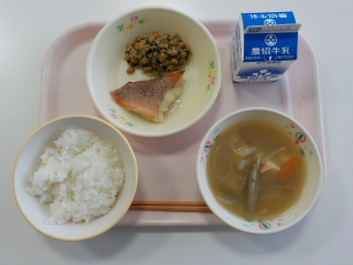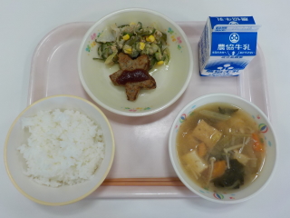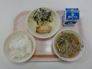 ごはん、さけのマヨコーン焼き、のリ酢和え、豆々みそ汁、牛乳 |
