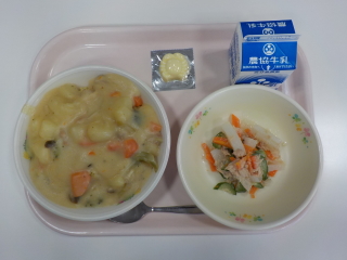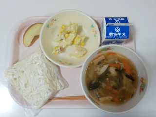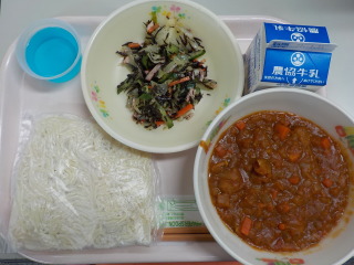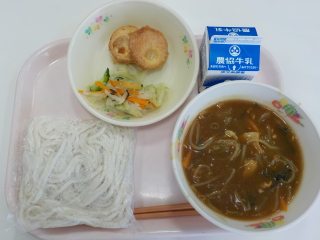 カレーうどん(米粉めん)、たくあん和え、牛乳、ふのラスク |