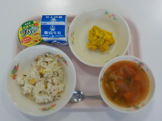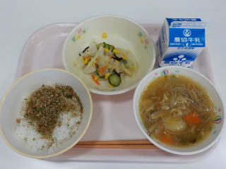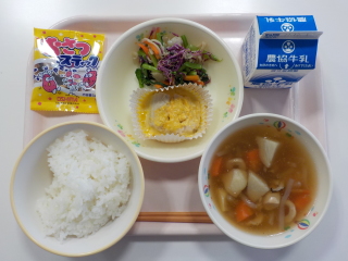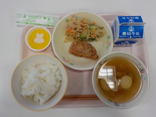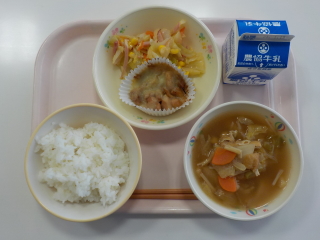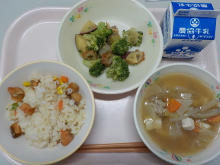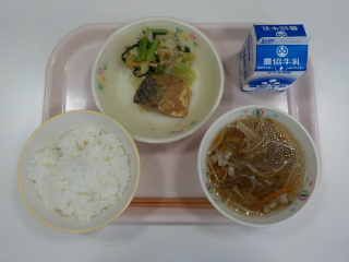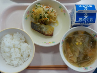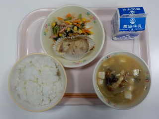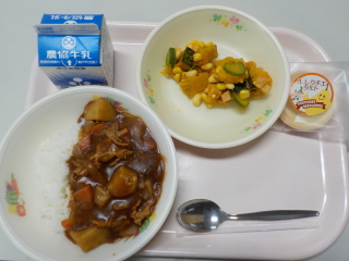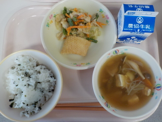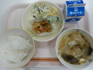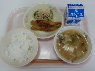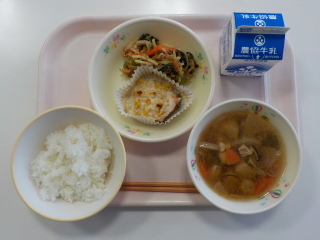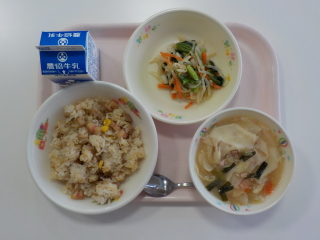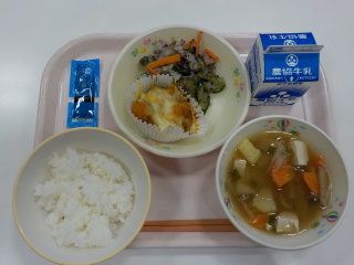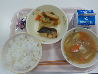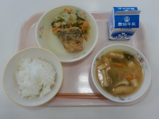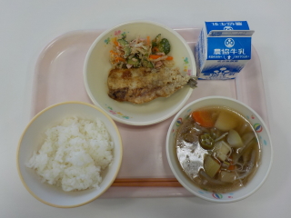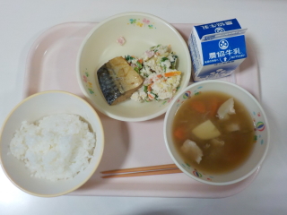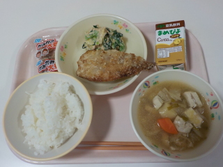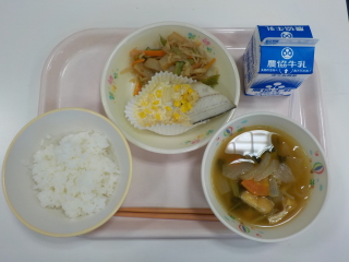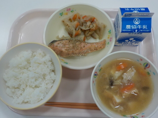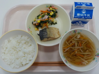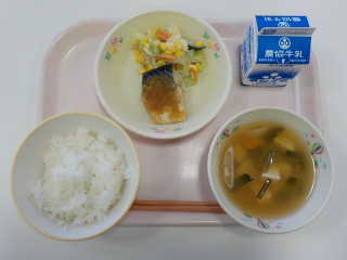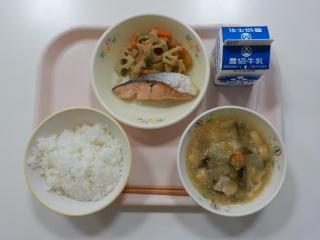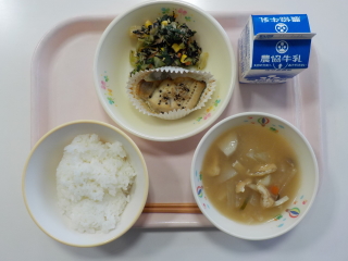 ごはん、さけのマヨコーン焼き、カレーおひたし、けんちん汁、牛乳