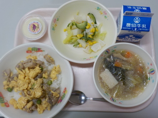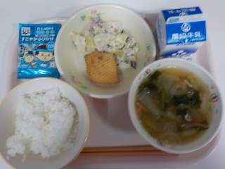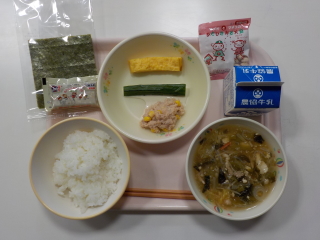 ごはん、いかのごまがらめ、切り干し大根のさっぱり和え、ふわふわたまごスープ、牛乳