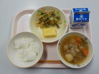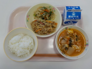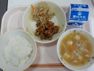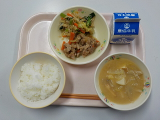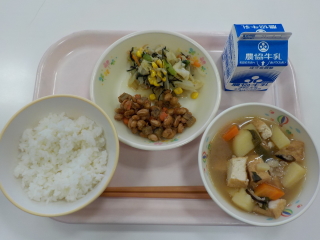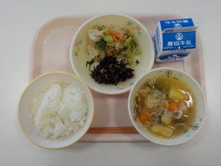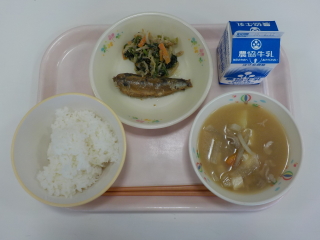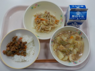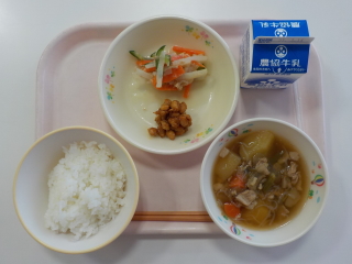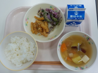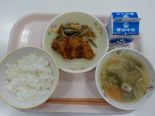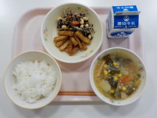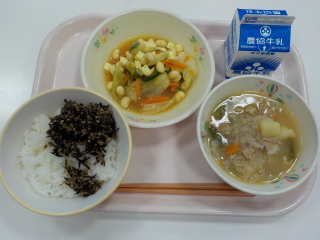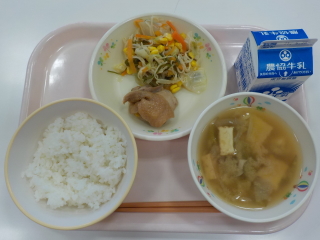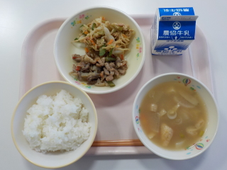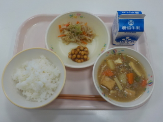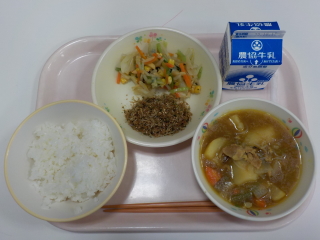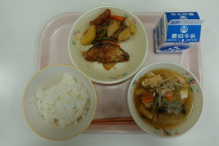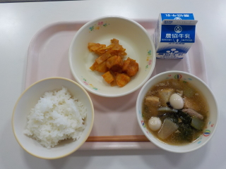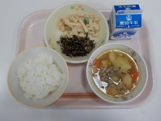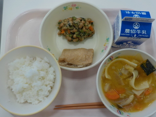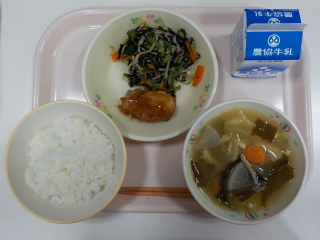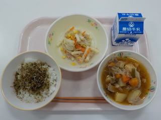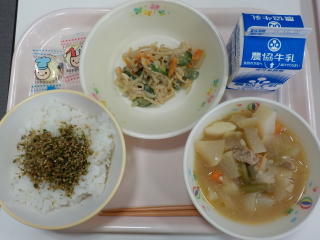 ごはん、きりざい、じゃが芋のきんぴら、どさんこ汁、牛乳
