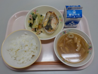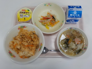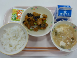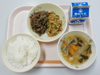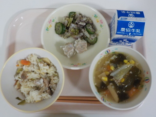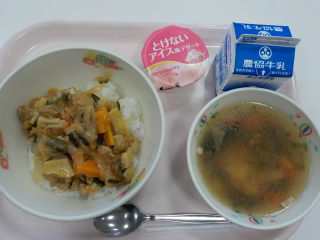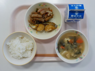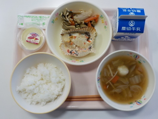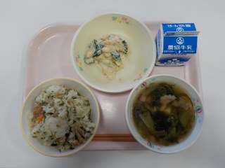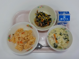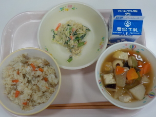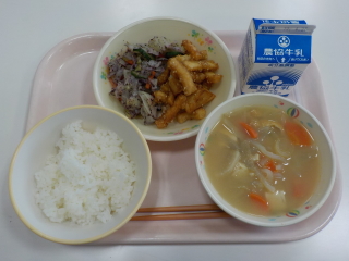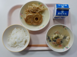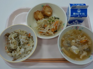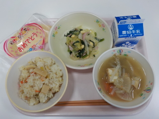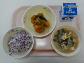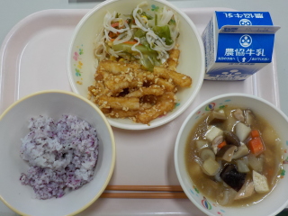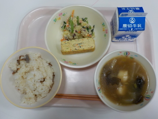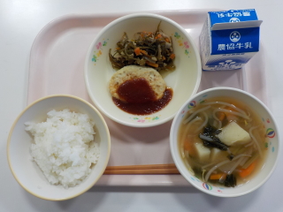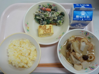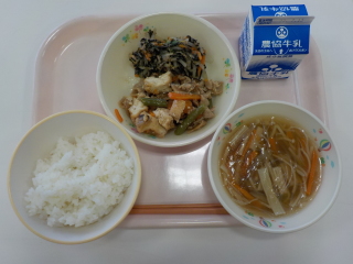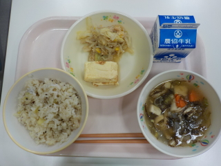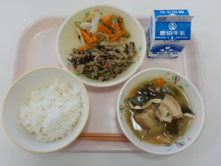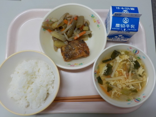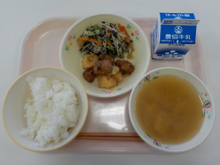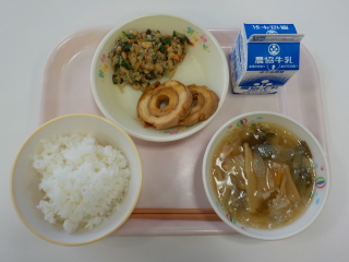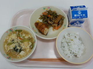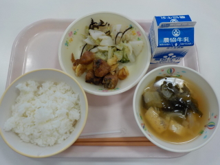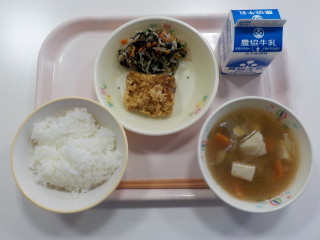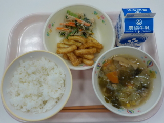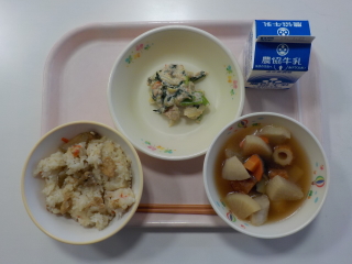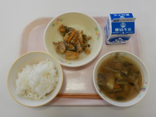 ごはん、車ふの揚げ煮、切り干し大根のさっぱり和え、かきたまみそ汁、牛乳 |