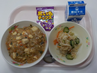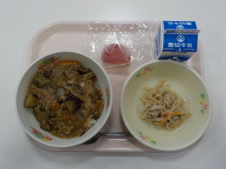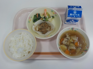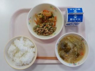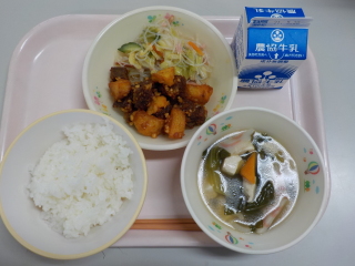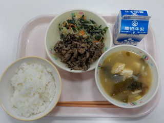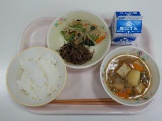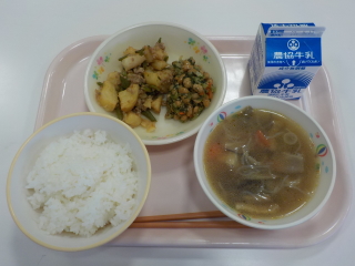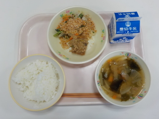 ごはん、鉄火みそ、磯ドレッシング和え、厚揚げとじゃがいものオイスターソース煮、牛乳 |