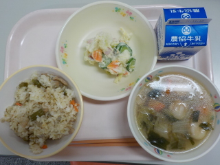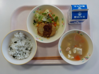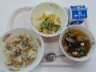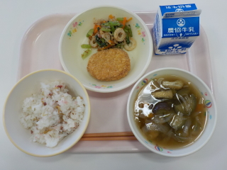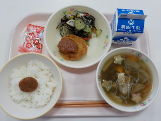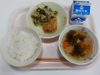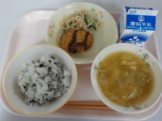 わかめごはん、コロッケ、バンバンジーサラダ、油揚げとキャベツのみそ汁、牛乳 |