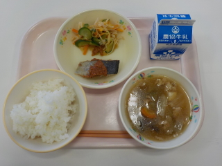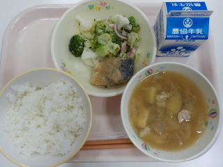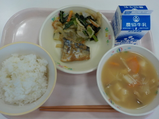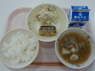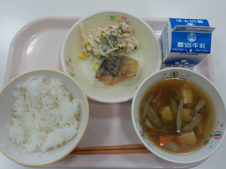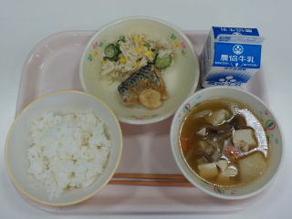 ごはん、さばの生姜煮、昆布あえ、具たくさん豚汁、牛乳