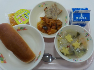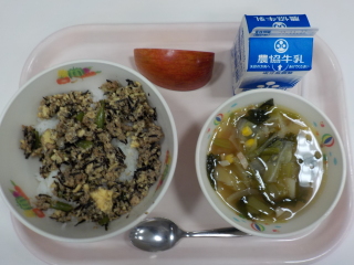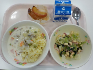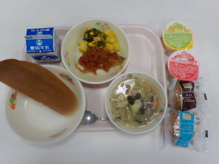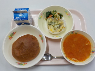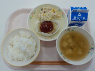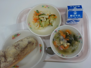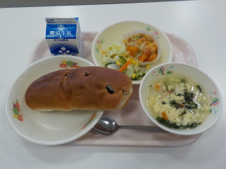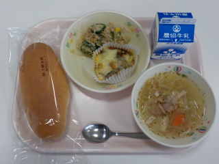 アップルチップパン、大豆とひじきのチーズ焼き、アーモンドあえ、野菜コンソメスープ、牛乳 |