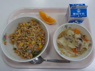 6年生のリクエストメニュー。焼き豚チャーハンとみそワンタンスープです! |
