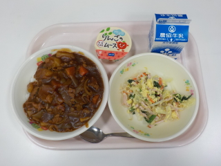 ハヤシライス、ミモザサラダ、牛乳、いちごクリームチーズ |
