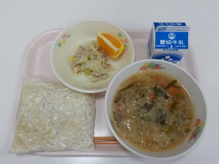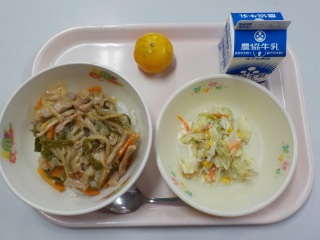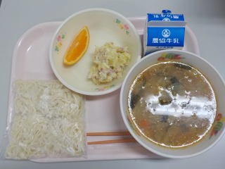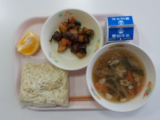 ゆで中華麺、しょうゆラーメンスープ、レバーとポテトの仲良し和え、いよかん、牛乳