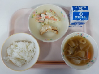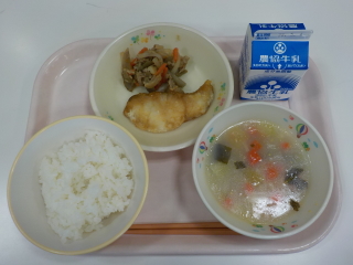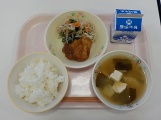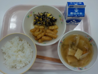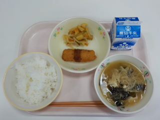 ごはん、たらフライ、茎わかめのきんぴら、塩鶏汁、牛乳 |