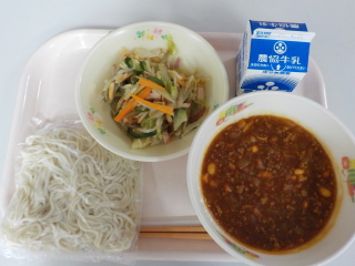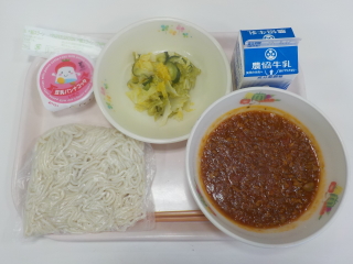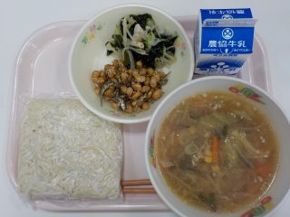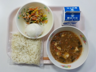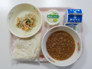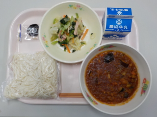 ソフトめん、大豆入りミートソース、ごぼうとナッツのサラダ、牛乳 |