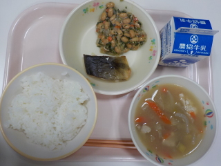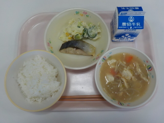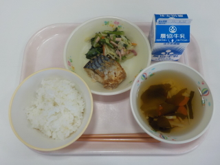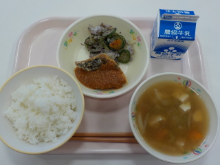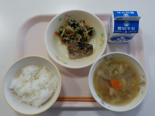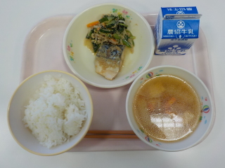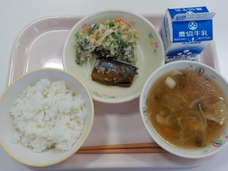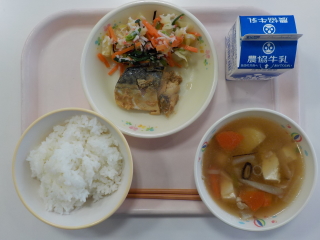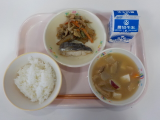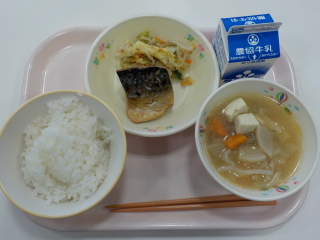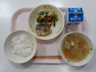 ごはん、さばのしょうが煮、たくあん和え、みそけんちん汁、牛乳 |