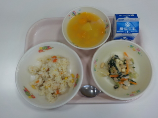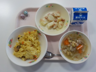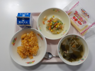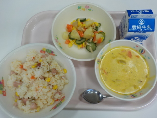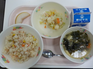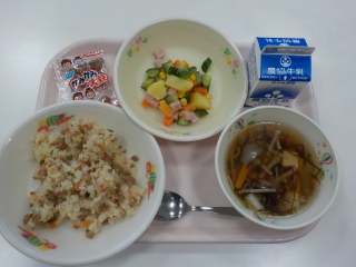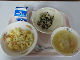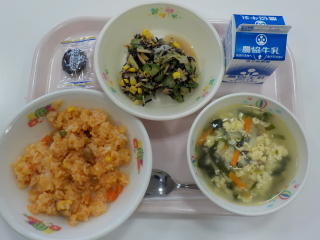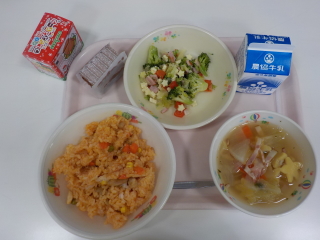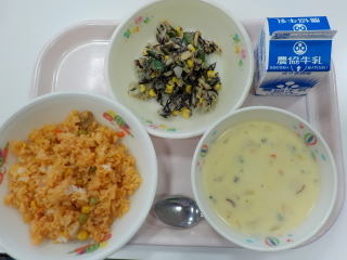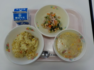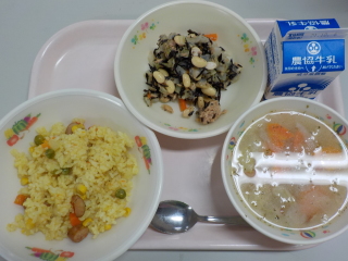 カレーピラフ、ひじきとアーモンドのサラダ、ウインナーと大豆のスープ、牛乳 |