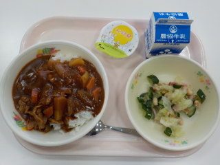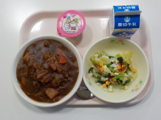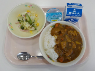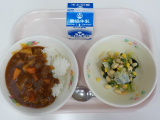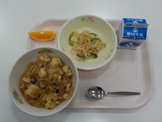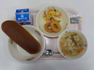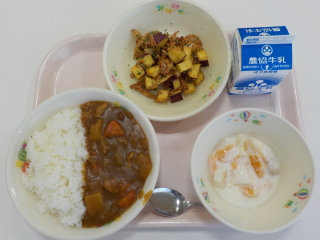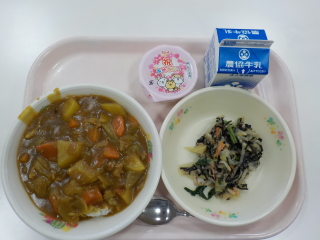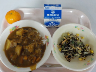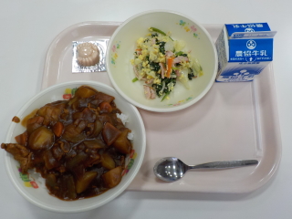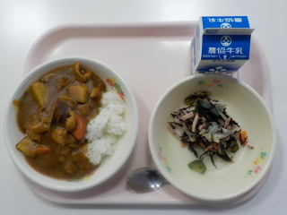 ごはん、いかのカレー揚げ、ひじきサラダ、たまねぎのみそ汁、牛乳 |