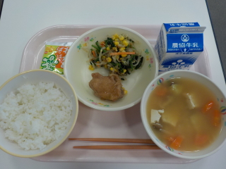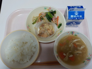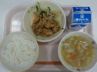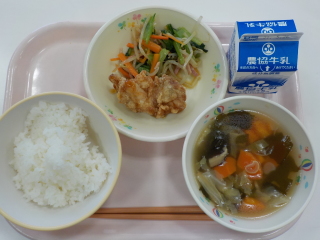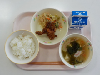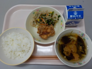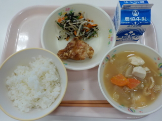 ごはん、とりの唐揚げ、もやしと青菜のおかかあえ、すまし汁、牛乳 |