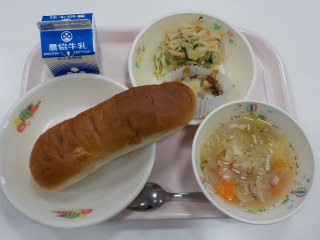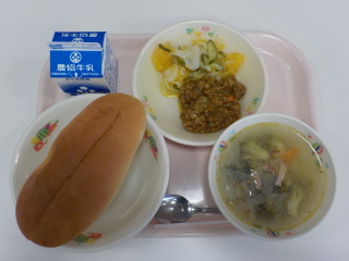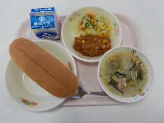 背割れコッペパン、チリコンカン、アスパラサラダ、アルファベットマカロニスープ、牛乳 |