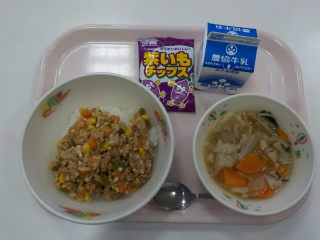そぼろ丼、ワンタンスープ、牛乳、紫芋チップス |